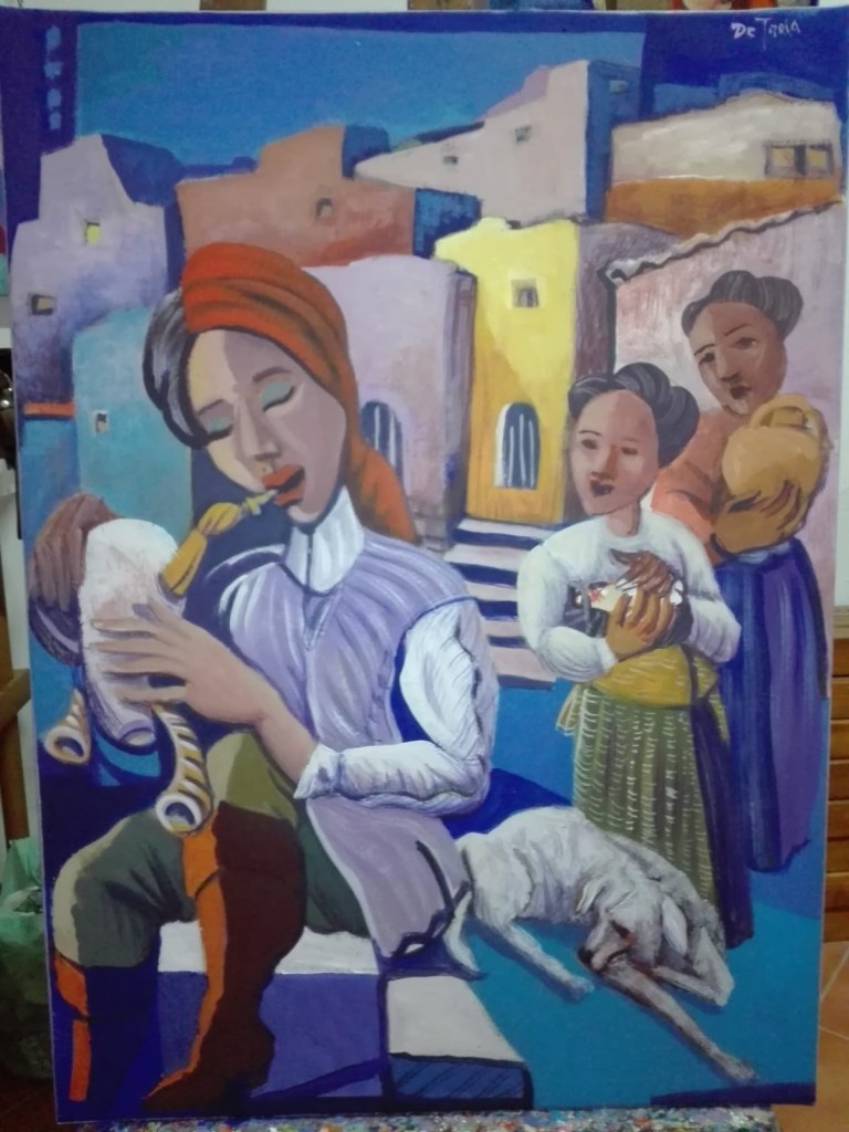 Terrei anche a sottolineare quanto la vivacità cromatica o diversamente le penombre, spennellate con metodo e intento, siano già direttive contenutistiche; ancora la padronanza delle linee curve o diritte e dei contorni incisivi o sfumati abbiano una precisa contestualizzazione. Inoltre l’importanza delle prospettive che, in De Troia, trovo fondamentali. In ogni dipinto giganteggia la figura protagonista perché l’artista ci indica già, con il richiamo alle dimensioni il tema principale quasi a voler titolare l’opera mentre le “comparse” risultano rimpicciolite o in spazi marginali.