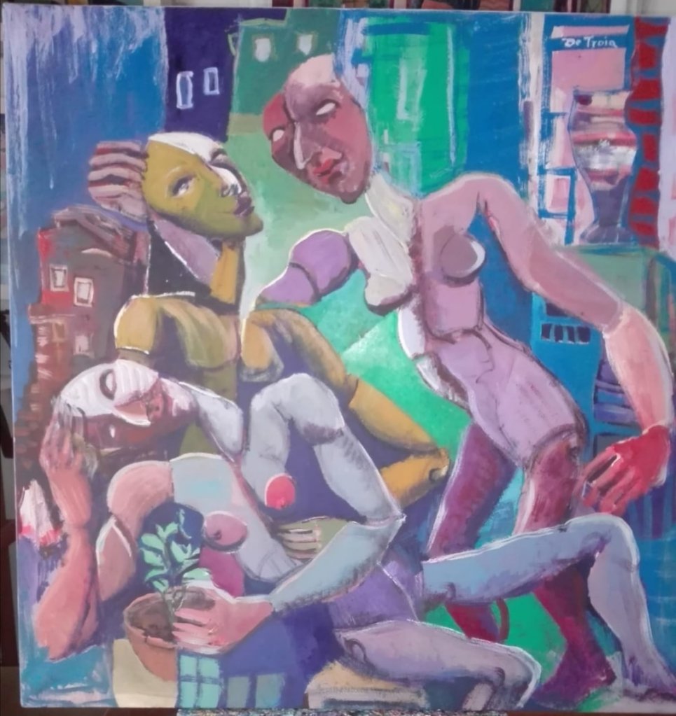 Il nostro Artista porta quindi in scena la vita, con tutte le relazioni, che siano di coppia, o collettive, in ogni ambito, spaziando dall’approccio sociale a quello politico, ambientale. I suoi protagonisti diventano teatranti, aggettivazione non dispregiativa ma a sottolineare l’esasperazione del modus vivendi. In fondo il teatro recita la quotidianità e sul palco tutto risulta dilatato per captare l’attenzione, dalla scelta degli abiti, al trucco eccessivo, alla gestualità. La stessa gestualità teatrale si distingue assolutamente da quella cinematografica, più minimalista. E in tale contesto trova aderenza l’arte del De Troia, in cui tutto risulta ampliato, ingigantito, fino a deformare i tratti interiori per renderli evidenti agli occhi.