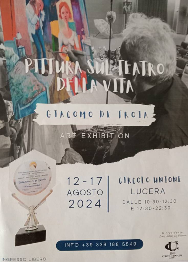 Da non mancare all’appuntamento artistico presso il Circolo Unione di Lucera 1860 con la Personale Pittura sul teatro della vita del M° Giacomo De Troia, artista della cittadina federiciana apprezzato non solo a livello nazionale ma internazionale.
